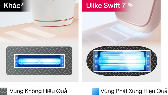 *Diện tích triệt 360 cm²/phút được tính dựa trên đầu phát xung 3,3 cm² × (0,4 giây phát xung + 0,7 giây khoảng nghỉ) × phát xung kép trong 1 phút sử dụng.